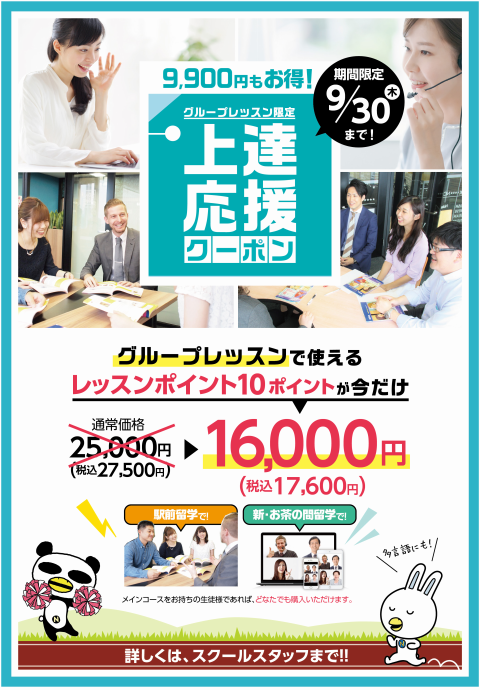 対面、もしくは新・お茶の間留学というオンラインでのレッスンでご使用頂けるレッスンポイント10Pを、特別価格で販売しております❗