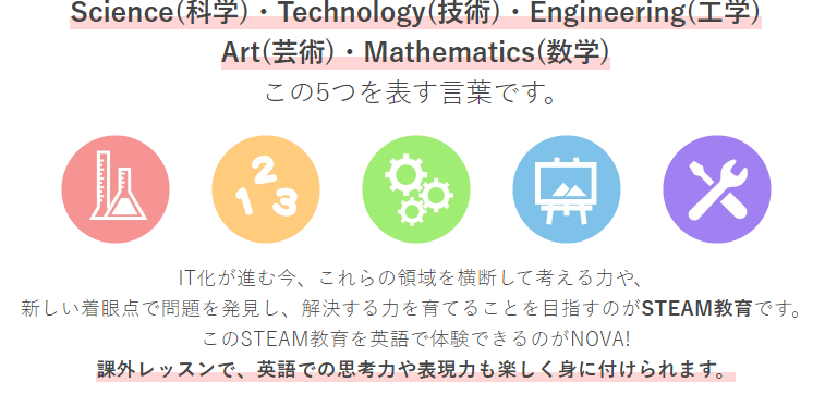 5つの分野の学習を通して、子どもを今後のIT社会に順応した競争力のある人材に育てていくための教育方針で、今世界各国で推進されていますΣ(・ω・ノ)ノ!実社会において課題解決のために求められる、コミュニケーション力とリーダーシップを養い、特定の分野の学習ではなく、複合的に組み合わせて思考する力を身につけます!