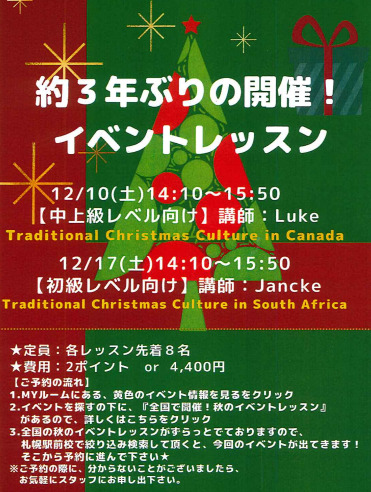 約3年ぶりのイベントレッスン開催になりますので、ぜひ、お時間ある方は足を運んでください!!もしかしたら、サンタからプレゼントがあるかもしれませんよ、、🎁😏