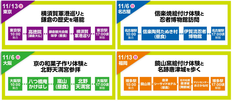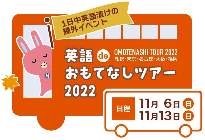 全国 5 都市の発着地から、外国人講師とバスで日本の観光名所を巡り、日本の歴史・文化を再発見できちゃうツアーです!外国人をガイドしたり、日本の魅力を伝えたりしながら、英語でのおもてなし術を学べる特別なプログラムとなっています。生徒様はもちろん、外部の方も参加できるので、お友達や家族と一緒に参加してみませんか⁈