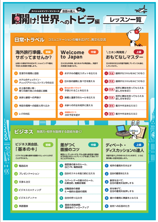 海外往来が再開する今、様々な場面での会話をスムーズにこなせることを目指し、「日常・トラベル」🛫、「ビジネス」💼の2つのシーン別、レベル別に選んでいただけます。