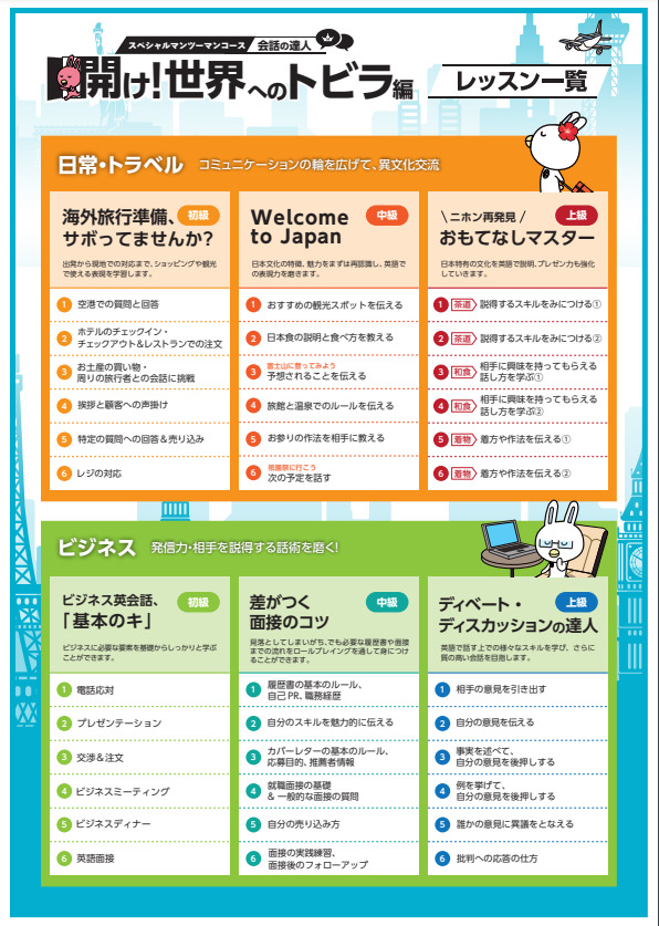 レッスンは、「日常・トラベル」・「ビジネス」の