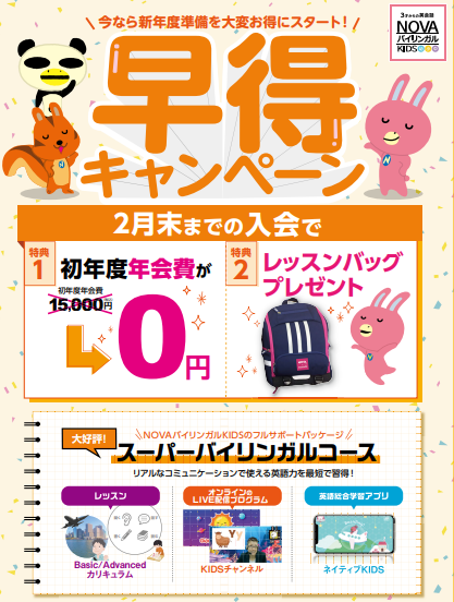 2月も残り2週間ちょっと!NOVAのお得なキャンペーンも残りわずかです!本日はKIDSのお得なキャンペーンをお届け👀🔊💨