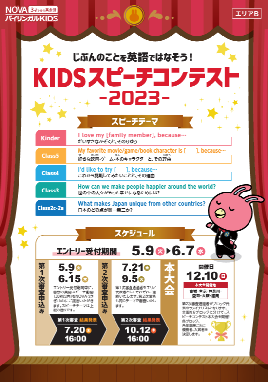 NOVAでは生徒様に発表の原稿から作っていただき、幼児部門、小学生部門、中高生部門の3つの部門でそれぞれクラスごとに異なるテーマでスピーチをしていただきます。