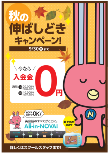 現在NOVAでは、9月30日まで秋の入会金無料キャンペーンを実施しております(^^♪