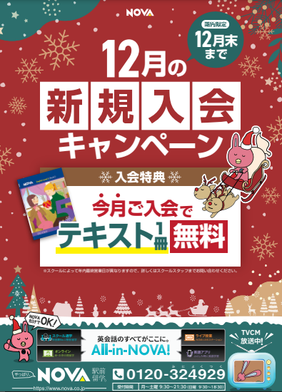 静岡県内のNOVAは12月23日(土)まで営業をしておりますので、