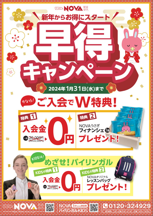 大人:入会金無料+NOVAうさぎフィナンシェ1箱プレゼント🎁