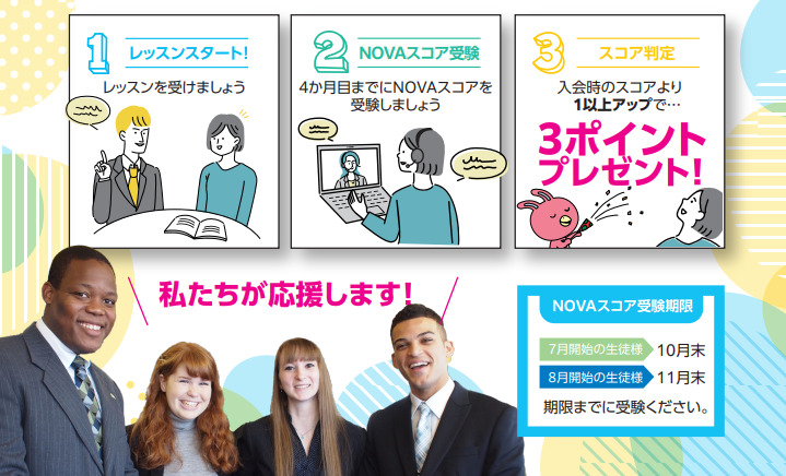 受講開始月から数えて 4 か月以内に NOVA スコア受講し、スコアアップが 1 以上だった場合、3 ポイントプレゼント🎁