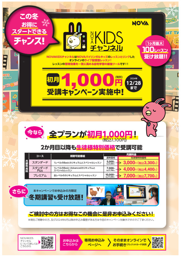 KIDSチャンネル同時受講のお申し込みで冬期講習がついてくる!!