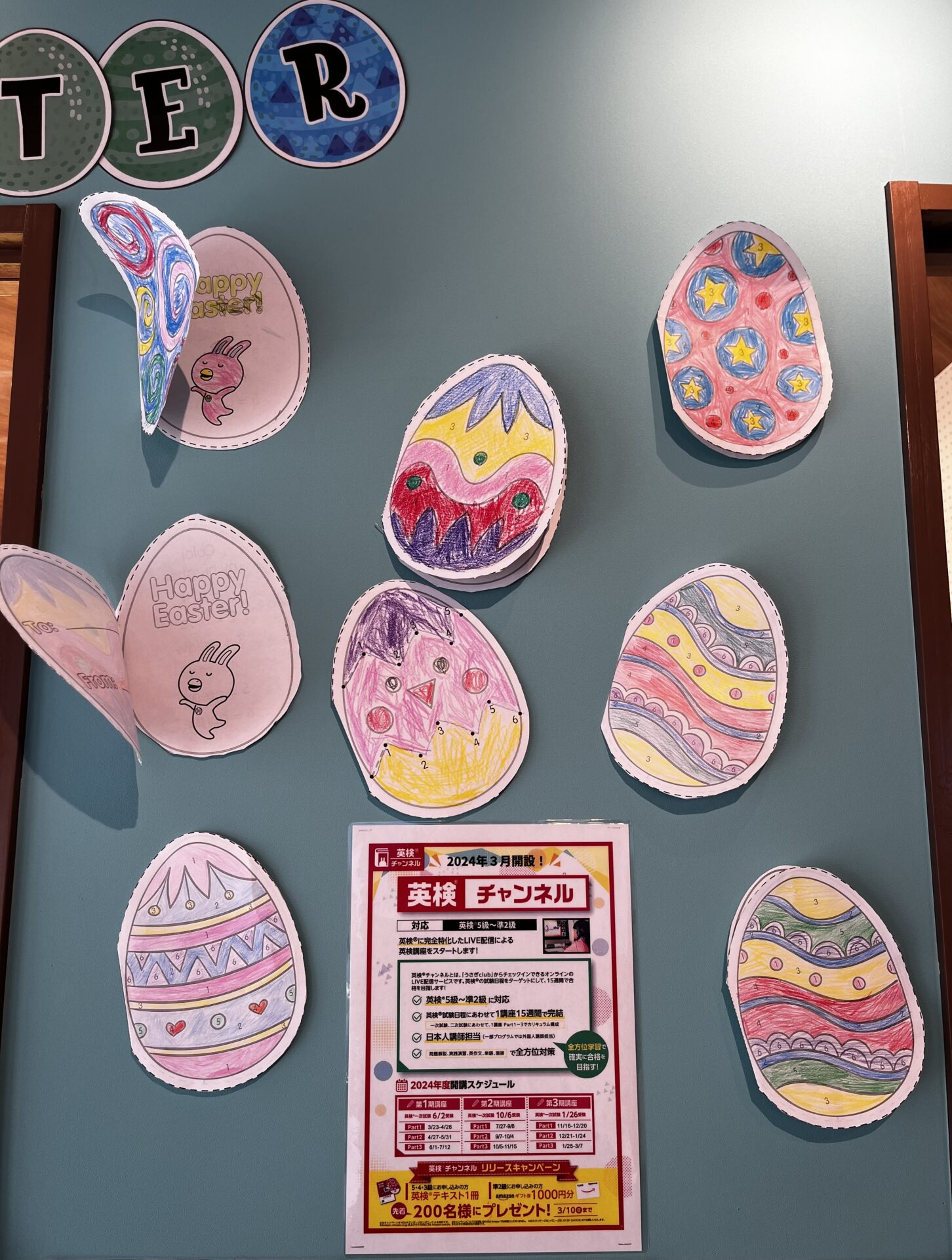 下記、イースターのイベントで、イースターエッグに塗り絵をしてきてもらったものを掲示している写真です🎵🎵