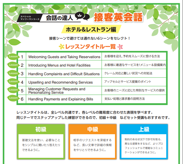 このコースは今回はホテルやレストランでの接客で使う表現をテーマに、語彙や対応力の強化、文法の苦手の解消に役立てることができます!さらに、このレッスンを受講を経てどのくらい力が付いたかNOVAスコアで測る事も出来ます!