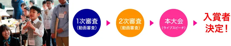レベル毎に決まったテーマに対して、30秒間のスピーチを披露し、優勝を目指します。一次審査、二次審査の動画審査に通過したお子様たちは、全国6会場で行われる本大会に出場、大勢の観客を前にライブでスピーチを行い、競います。各会場の優勝賞品はなんと短期海外留学!大変盛り上がるイベントです。
