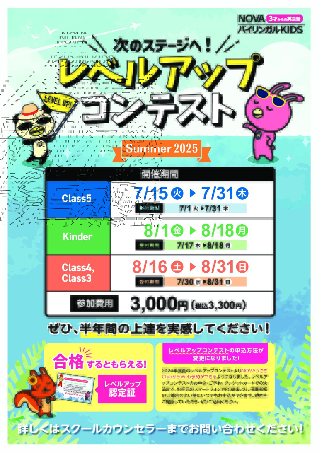 NOVAでは、生徒様のお力別にクラスを設定しており、レベルアップコンテストに合格後、次のクラスにレベルアップしていただけるシステムとなっています!(Class5.4.3)