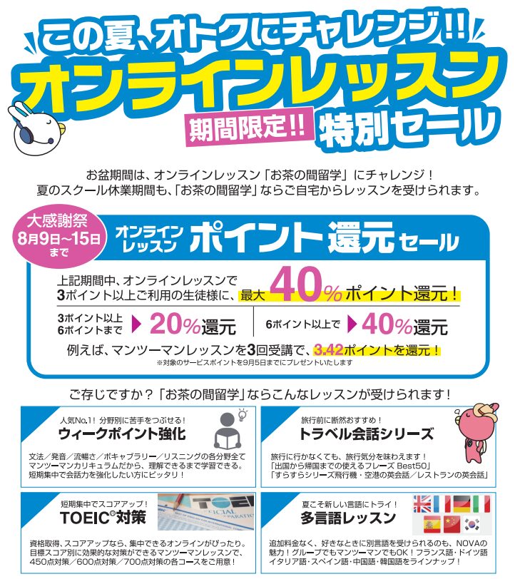 夏季休業期間中の「お茶の間留学」予約制レッスン消化ポイントに応じてサービスポイントを還元!
