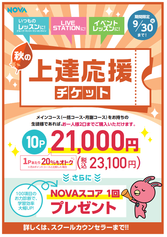 レッスンポイント10ポイントにNOVAスコア1回分がついた、今だけのお得なチケットが販売中です⭐