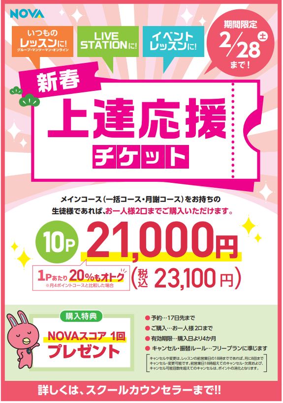 英会話スクール・英会話教室【NOVA渋谷校】🌸新春🌸応援上達チケット🎫は2月28日まで!!