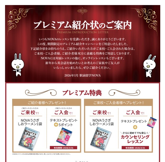 ご紹介者様→ご来校でNOVAうさぎグッズプレゼント!