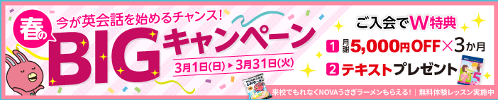 英語学習への1歩を踏み出せるよう、NOVAでは入会金0円、また今月は以下のキャンペーンがございます!