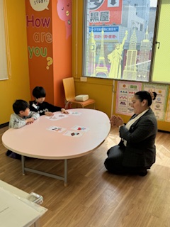 福笑いのように一人が目隠しをし、周りの子がUp!Down!と指示を出しながら、アイスクリームをカップの上に見事乗せることが出来ました✨
