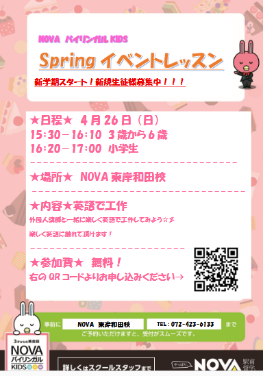 英会話スクール・英会話教室【泉大津/東岸和田/和歌山】NOVAバイリンガルKIDS4月🌸🐰🌸🐰イベントレッスンのご案内