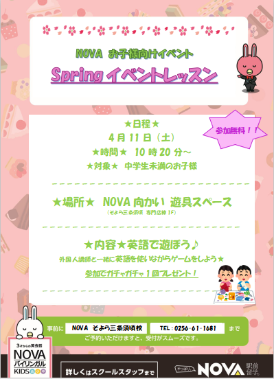 英会話スクール・英会話教室【NOVAそよら三条須頃校】KIDS向けイベント開催🌸