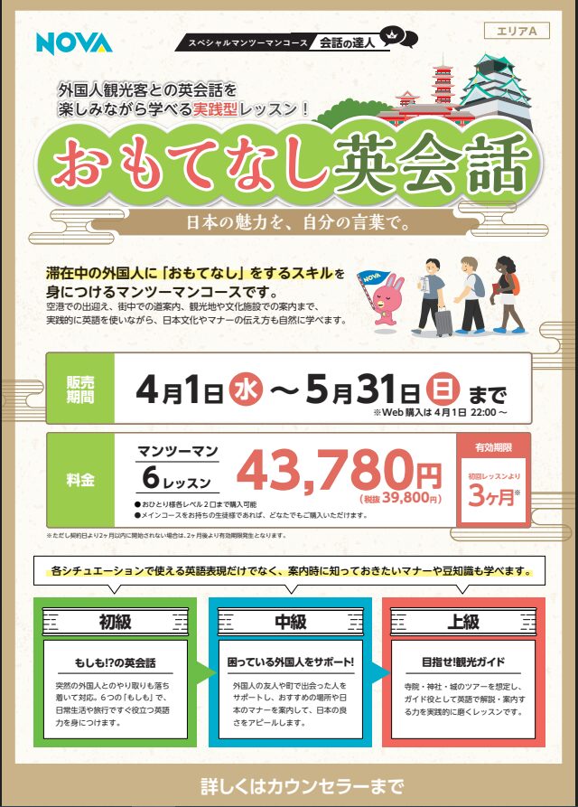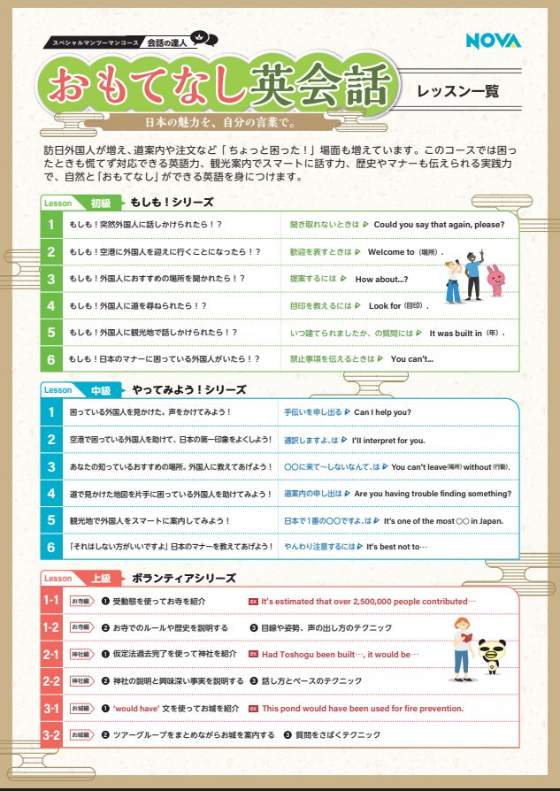 困ったときも慌てず対応できる英語力、観光案内でスマートに話す力、歴史やマナーも伝えられる実践力、自然と「おもてなし」ができる英語が身に付きます!🗾