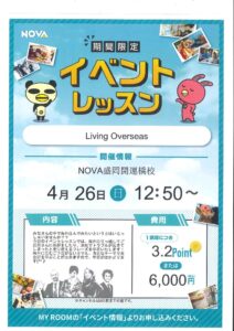 海外に住むというテーマをもとに英語の基礎力をアップできるイベントレッスンになっておりますのでぜひご参加くださいませ(*’▽’)