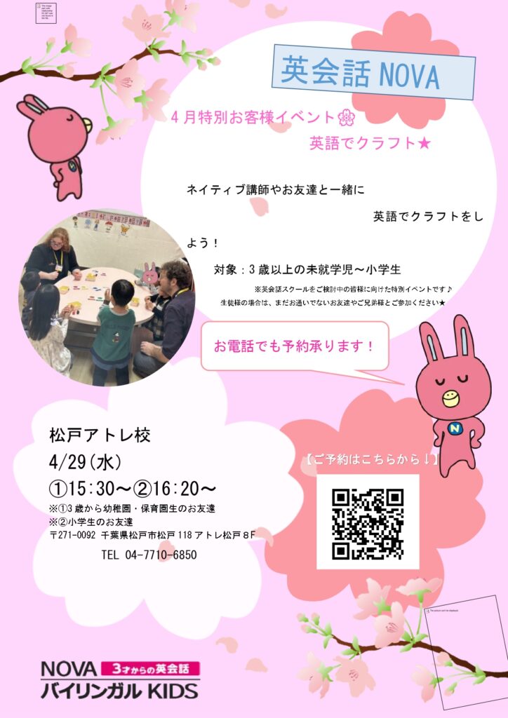 【4月29日(水)】NOVA松戸アトレ校にて、英語を話しながら工作を楽しむ「英語でクラフト」を開催いたします(^▽^)/
