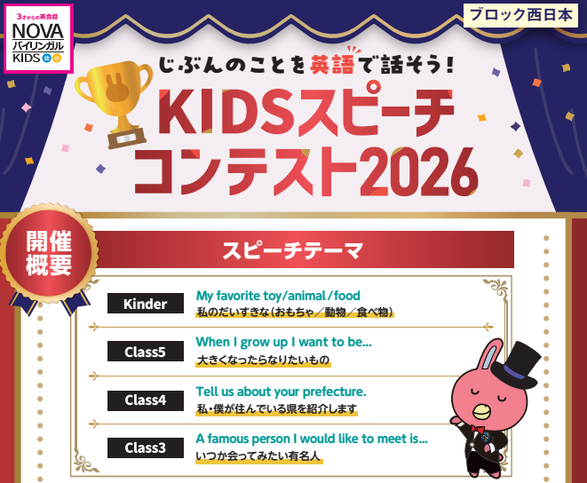 だからこそNOVAでは、Kinderさん・小学生のうちからスピーチに挑戦できるイベントを開催しています。