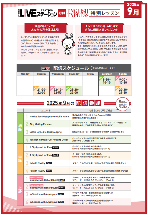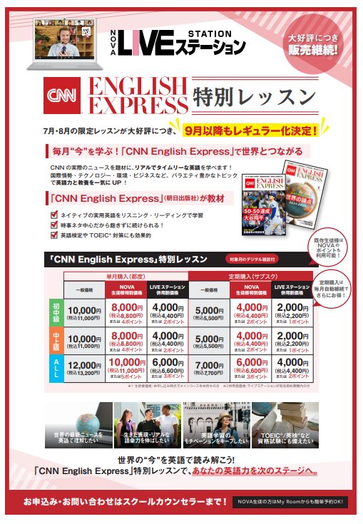 特典としまして、月刊誌『CNN ENGLISH EXPRESS』のデジタル版を、お選びの受講月にNOVA MY ROOM よりご覧いただけます!