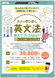みなさん、お元気ですか?今年も残り1か月、英会話を始めたいと思っていた方いませんか??ぜひNOVAで英会話を楽しく学んでいきましょう♪