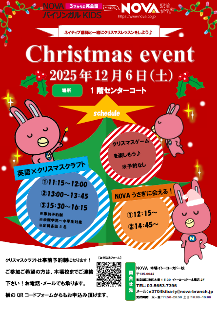 本日は、近隣校舎である「NOVA木場イトーヨーカドー校」で行われるクリスマスイベントのご案内です!🎅