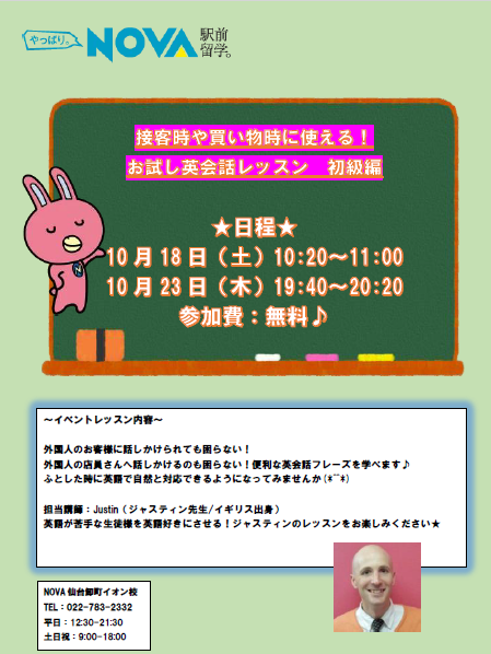 英会話レッスンをお探しならNOVA仙台卸町イオン校!