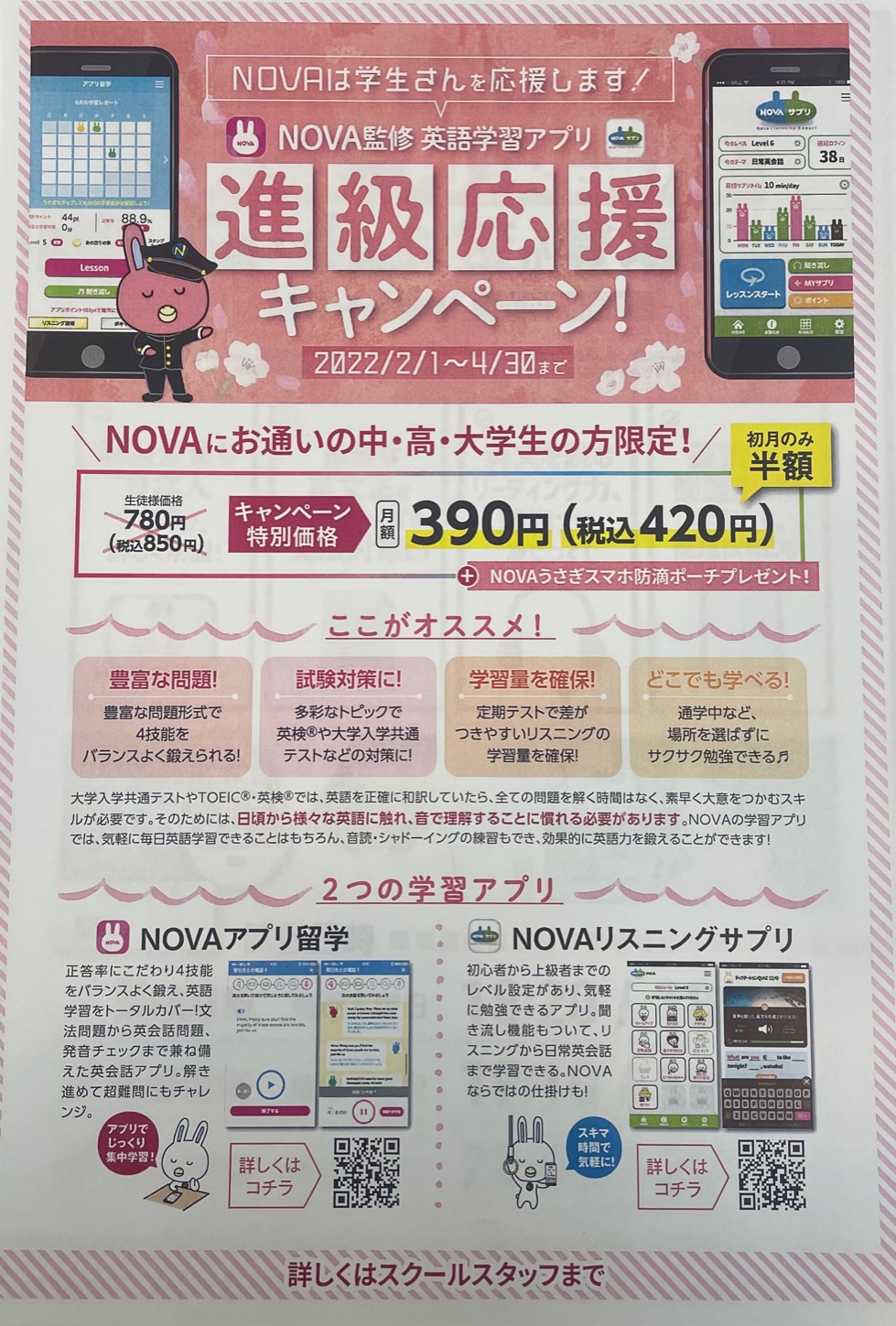 また、体験に来られてNOVAで頑張ってみようとご決断された方には、