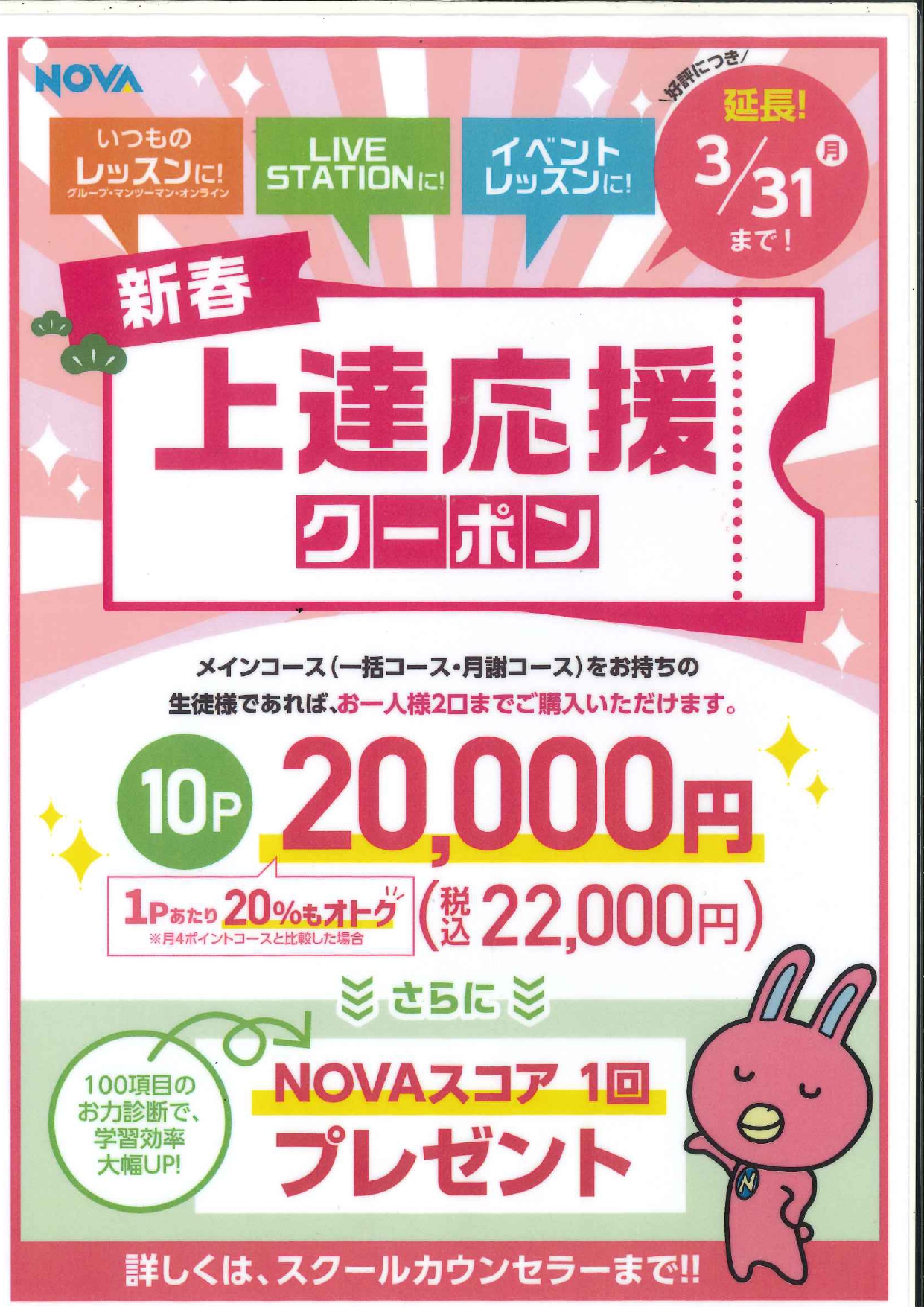 本日は《上達応援クーポン》についてお知らせいたします!こちらは10ポイント+NOVAスコア(2ポイント分)がお得にご購入いただけるお得なクーポンです!